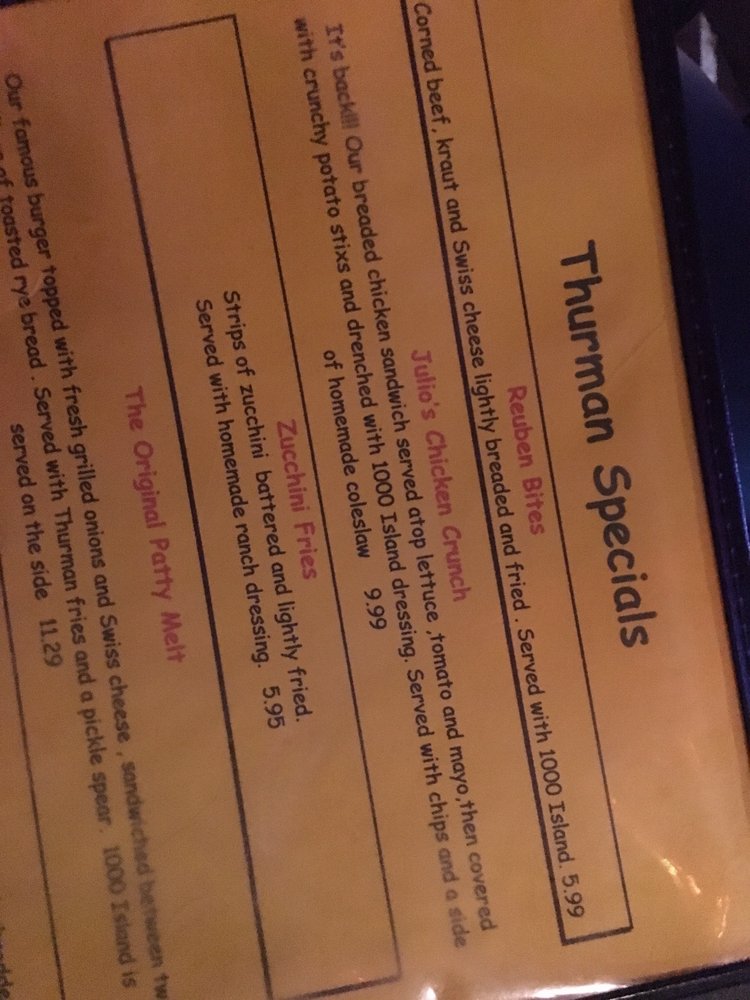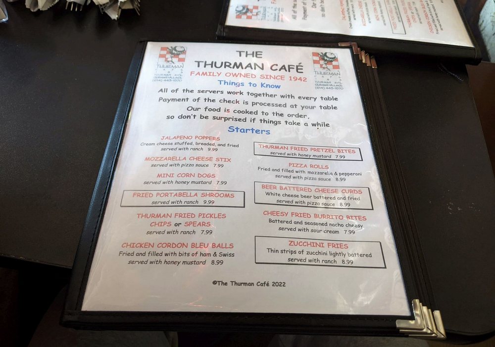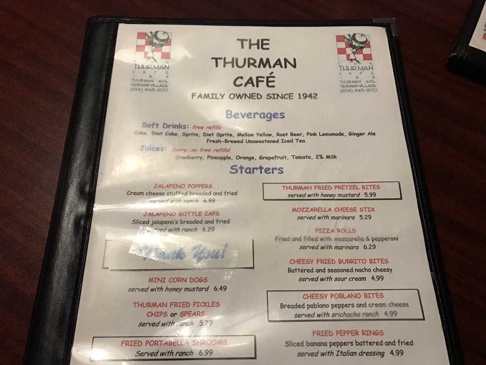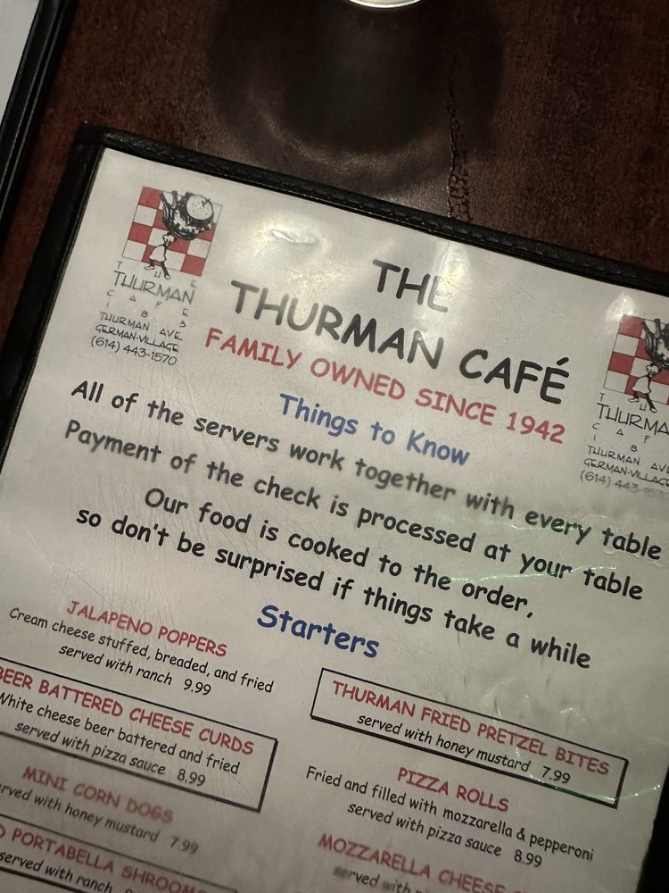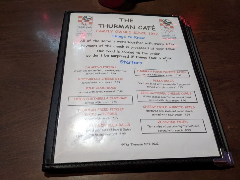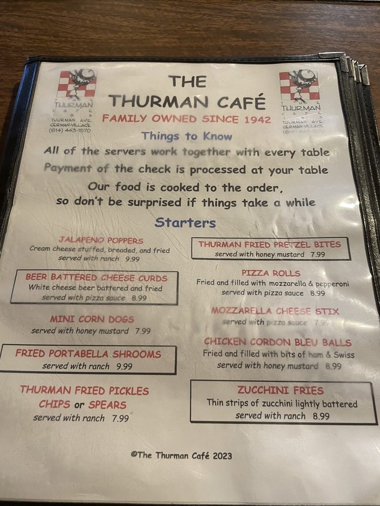 Introducing the menu at The Thurman Cafe, located in Columbus, OH, offers a diverse range of starters, including Jalapeno Poppers, Mozzarella Cheese Stix, and Chicken Cordon Bleu Balls. Their famous fries, like Thurman "Handcut" Fries and North Macedonian Fries, are loaded with unique toppings. Sloppy Fries options like ThurmaTeriGarlaYaki and ThurmaGoldiGarlaLina add a flavorful twist to traditional fries. Customers rave about the friendly atmosphere and excellent service at this local dive bar. The Thurman Burger is a standout dish that patrons highly recommend, with many returning for its delicious flavor. The Thurman Cafe is praised for its memorable dining experience, making it a must-visit for burger enthusiasts in the area.